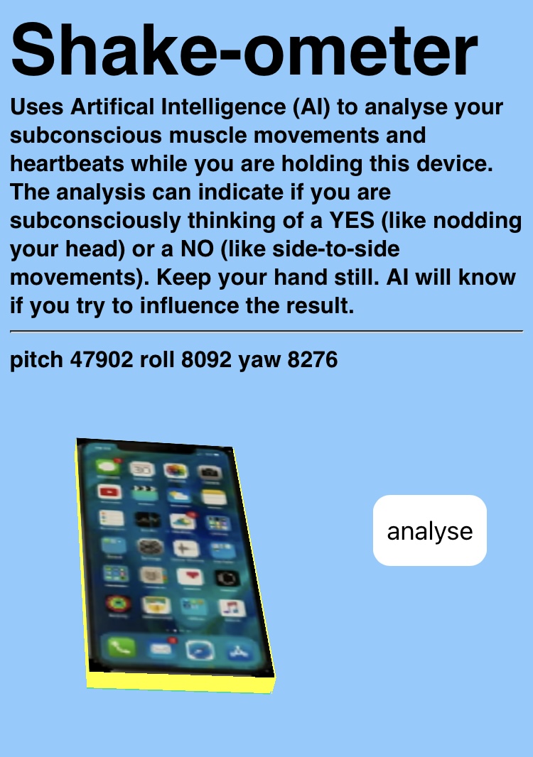 | Shake-ometer Detects micro muscle movements as they hold your phone on the palm of their hand. The suggestion is that AI is detecting whether they are subconsciously thinking of a YES or NO. Your flic button secretly determines the result. | |